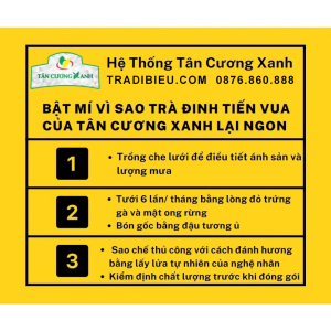 → Chừng đó có lẽ chưa đủ để nói về Trà Đinh Tiến Vua hay còn có tên gọi khác là “Cực phẩm trà”: thành phẩm trà khô có màu xanh đen nhỏ như chiếc kim, có vân xoắn chặt nằm gọn đều, khác với những búp chè khô vẫn thường thấy. 1kg Trà đinh tiến vua sẽ cho ra 60 lít nước trà ngon, gấp 3 lần so với trà nõn tôm thượng hạng.