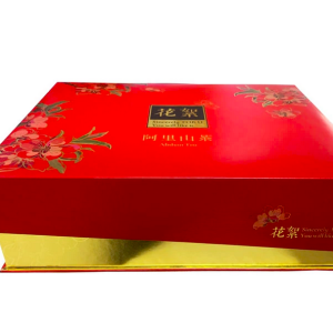 Bên trong hộp phủ lụa vàng sang trọng. Ngoài hộp in nhũ tráng kim cao cấp